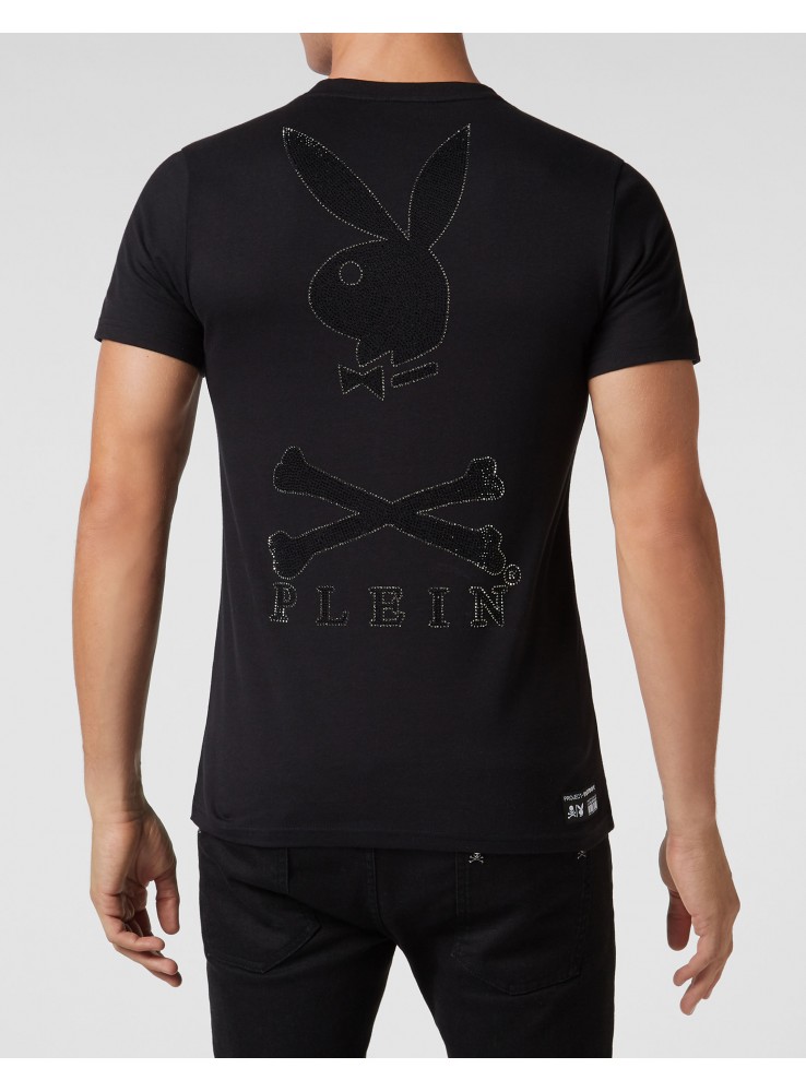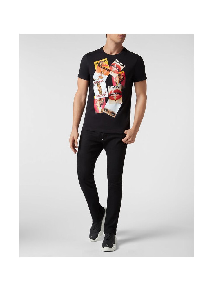 Camiseta con un estampado de varias portadas de revistas PLAYBOY en la parte delantera y cristales con el logotipo de calavera de Playboy y letras PLEIN impresas en la parte posterior por PHILIPP PLEIN x PLAYBOY