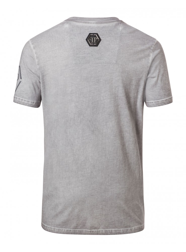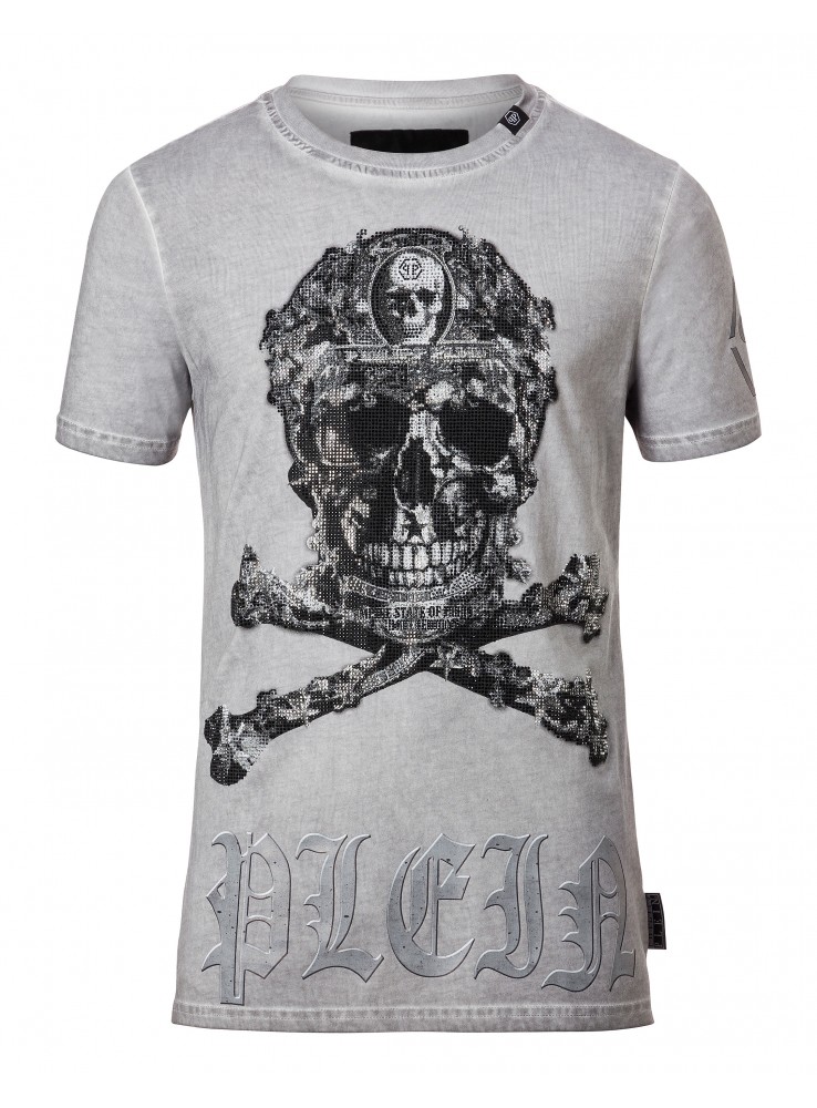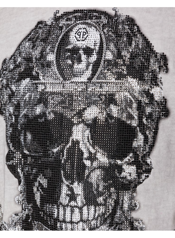 Camiseta de felpa de algodón. La icónica calavera enriquecida con cristales está estampada en la parte frontal con el nombre de la marca. Logo de metal cosido en el canesú.