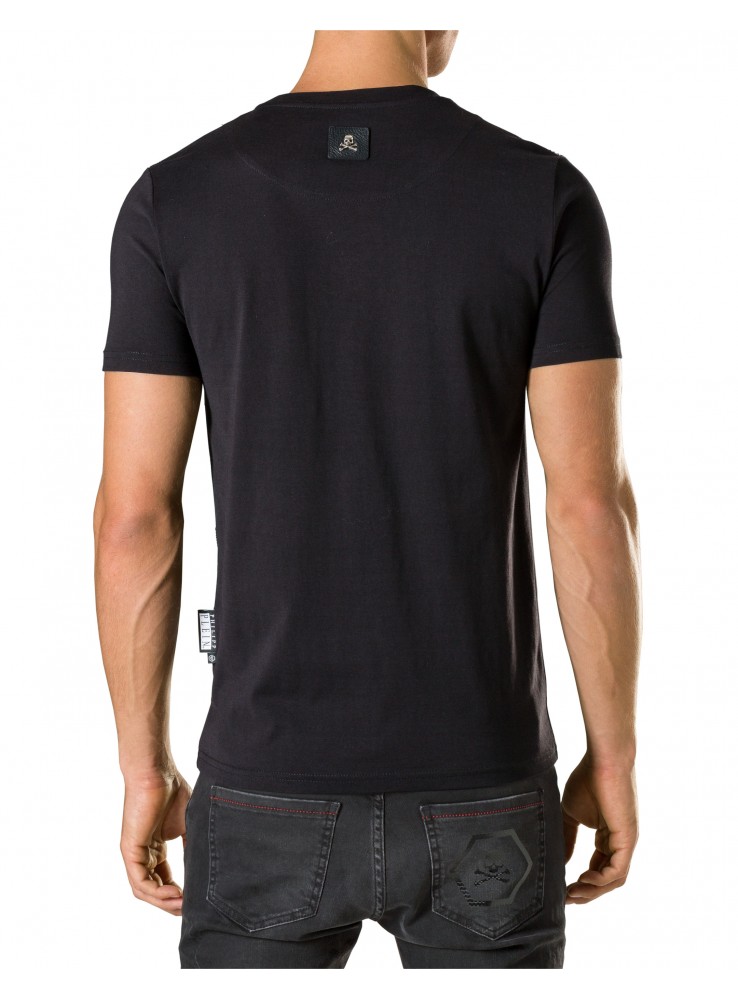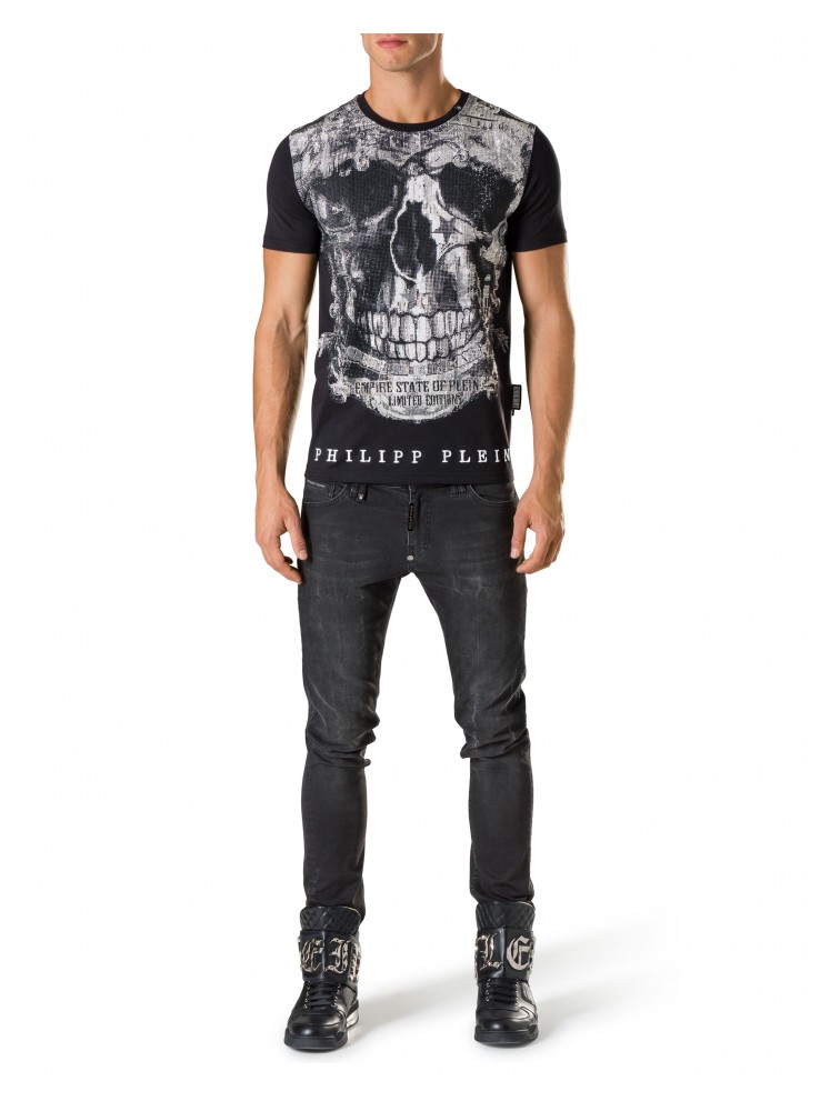 Camiseta de felpa de algodón. Grande estampado de la icónica calavera enriquecida con cristales en la parte frontal. Debajo, se encuentra bordado el nombre de la marca.