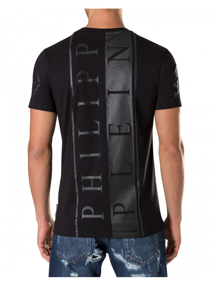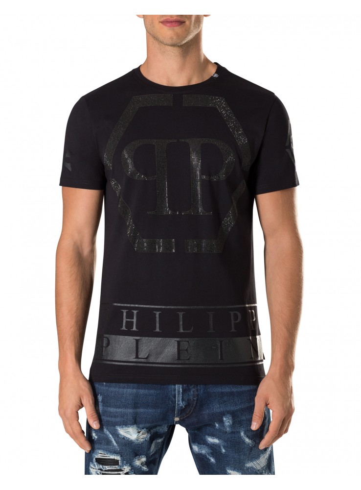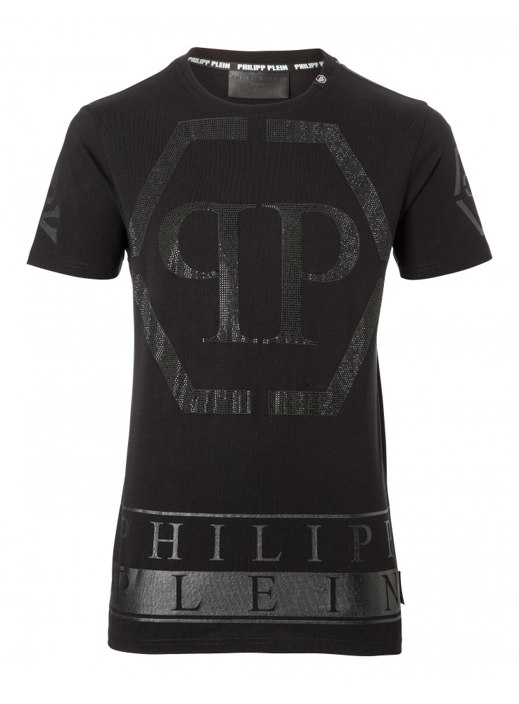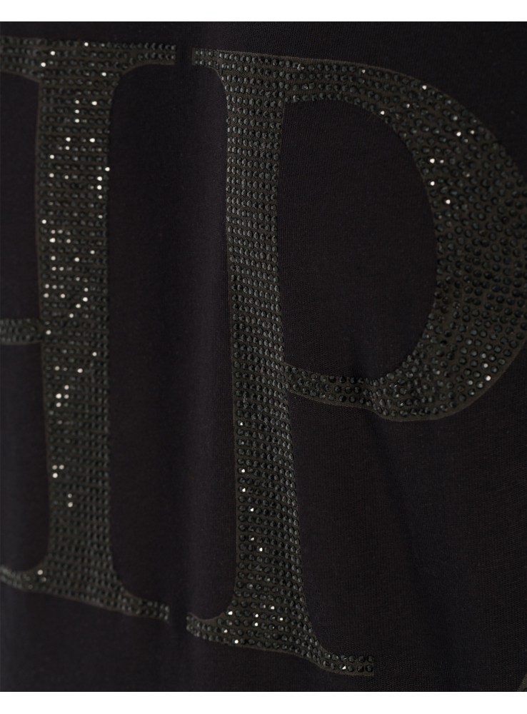 Camiseta de felpa de algodón. Logo hexagonal decorado con pequeños remaches estampados en la parte frontal. Nombre de la marca estampado en el canesú.