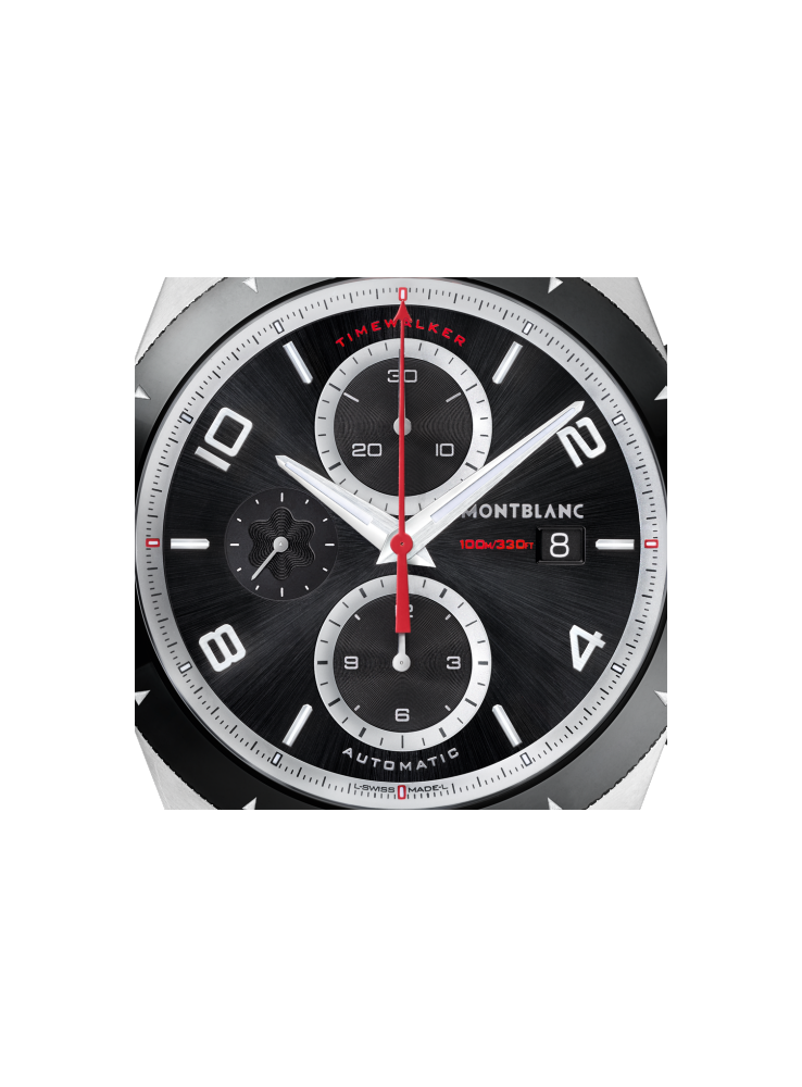 Destacando su dinámico funcionamiento, este reloj con prominente contraste de negro y plateado-blanco está inspirado en los instrumentos de los coches de carreras. Su calibre MB 25.07 incluye una complicación de cronógrafo y un segundero pequeño a las 9. Desde los segundos del cronógrafo central hasta los contadores de 30 minutos y 12 horas alineados verticalmente a las 12 y a las 6, las escalas en plateado-blanco están realzadas con una pista de minutos de precisión, revestimiento Super-LumiNova® y marcas rojas cada 15 minutos para garantizar una legibilidad perfecta en la esfera negra, tanto de día como de noche. El icónico segundero rojo del cronógrafo con la punta en forma de la flecha Minerva destaca sobre las agujas Dauphine rodiadas. Para leer una segunda hora, solo es necesario girar el bisel de cerámica negra con acabado moleteado en el flanco. Resistente al agua hasta 100 metros, la caja de 43 mm de acero con acabado satinado también evoca el espíritu del automovilismo con sus asas semiesqueletizadas inspiradas en las líneas aerodinámicas de los habitáculos de los coches clásicos. La correa de caucho tiene agujeros asimétricos, como los de los guantes de carreras, y un patrón de agarre en el interior para una mejor adhesión a la muñeca y para que la correa respire. El triple cierre desplegable especialmente desarrollado ofrece flexibilidad y máximo confort en la muñeca. Para garantizar una legibilidad y un rendimiento óptimos, el reloj es sometido a las rigurosas pruebas del Montblanc Laboratory Test 500.