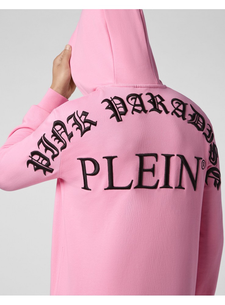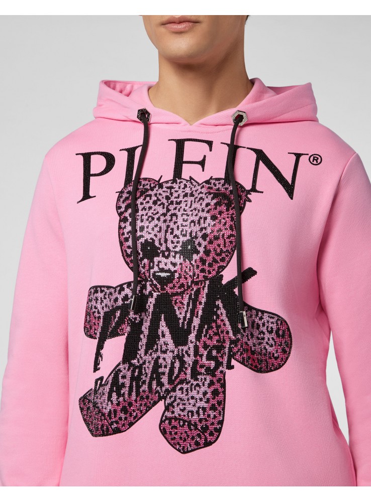 Philipp Plein ha creado Pink Paradise, una colección cápsula especial para demostrar que este color tan romántico puede revelar un lado muy agresivo. Esta sudadera de felpa de algodón rosa con capucha está adornada con un oso de peluche en tono de rosa, y está completamente estampada con cristales en un patrón moteado. El nombre de la firma y Pink Paradise están estampados en la parte posterior. Puños y borde inferior de canalé.